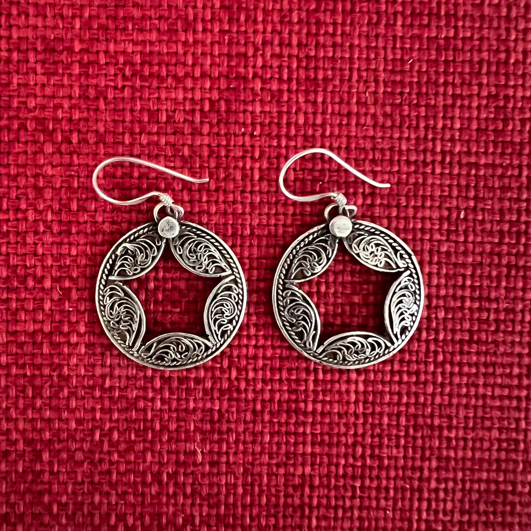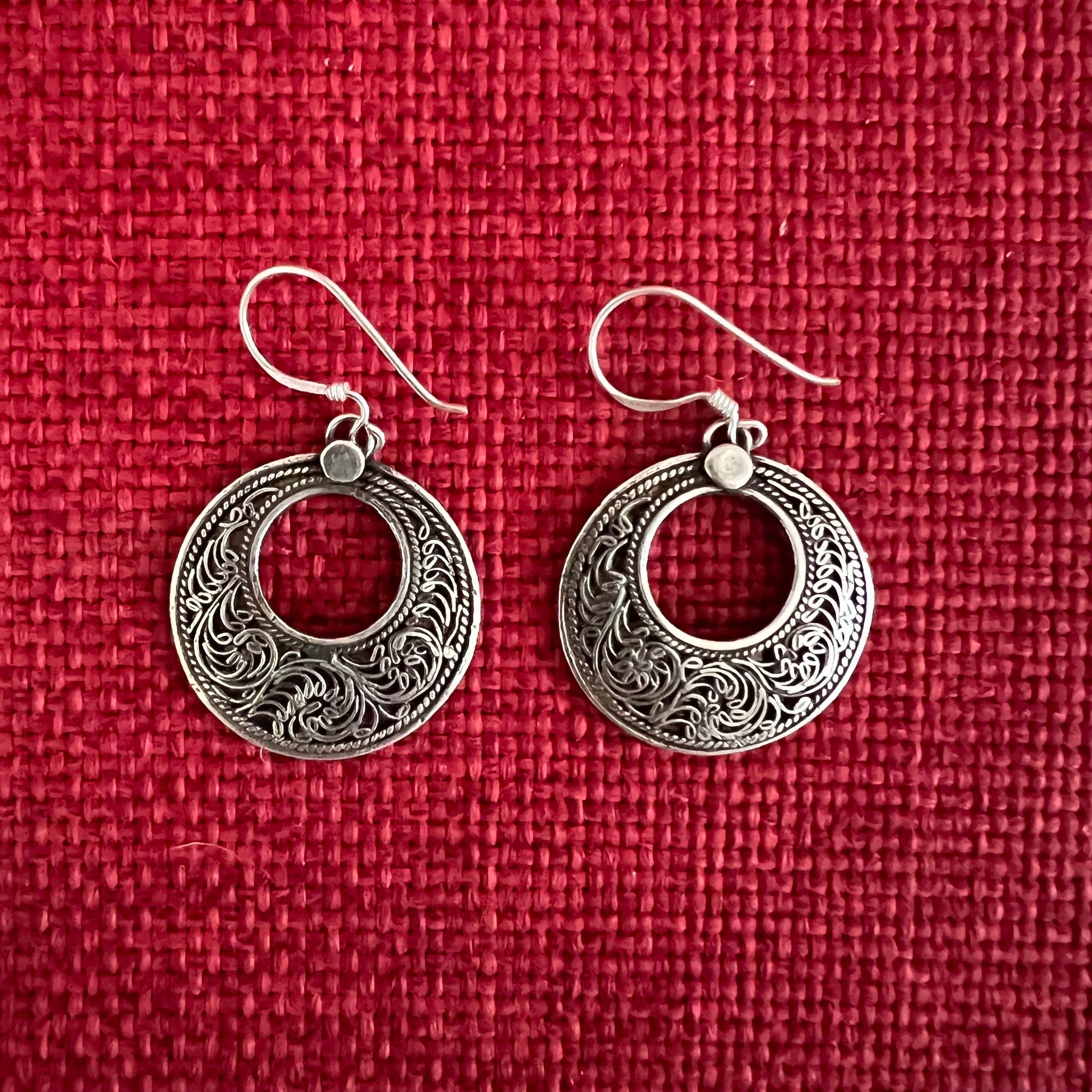 These sterling silver filigree earrings in a round shape with a hole in the centre, were handcrafted in Nepal. Size: 2.3cm diameter