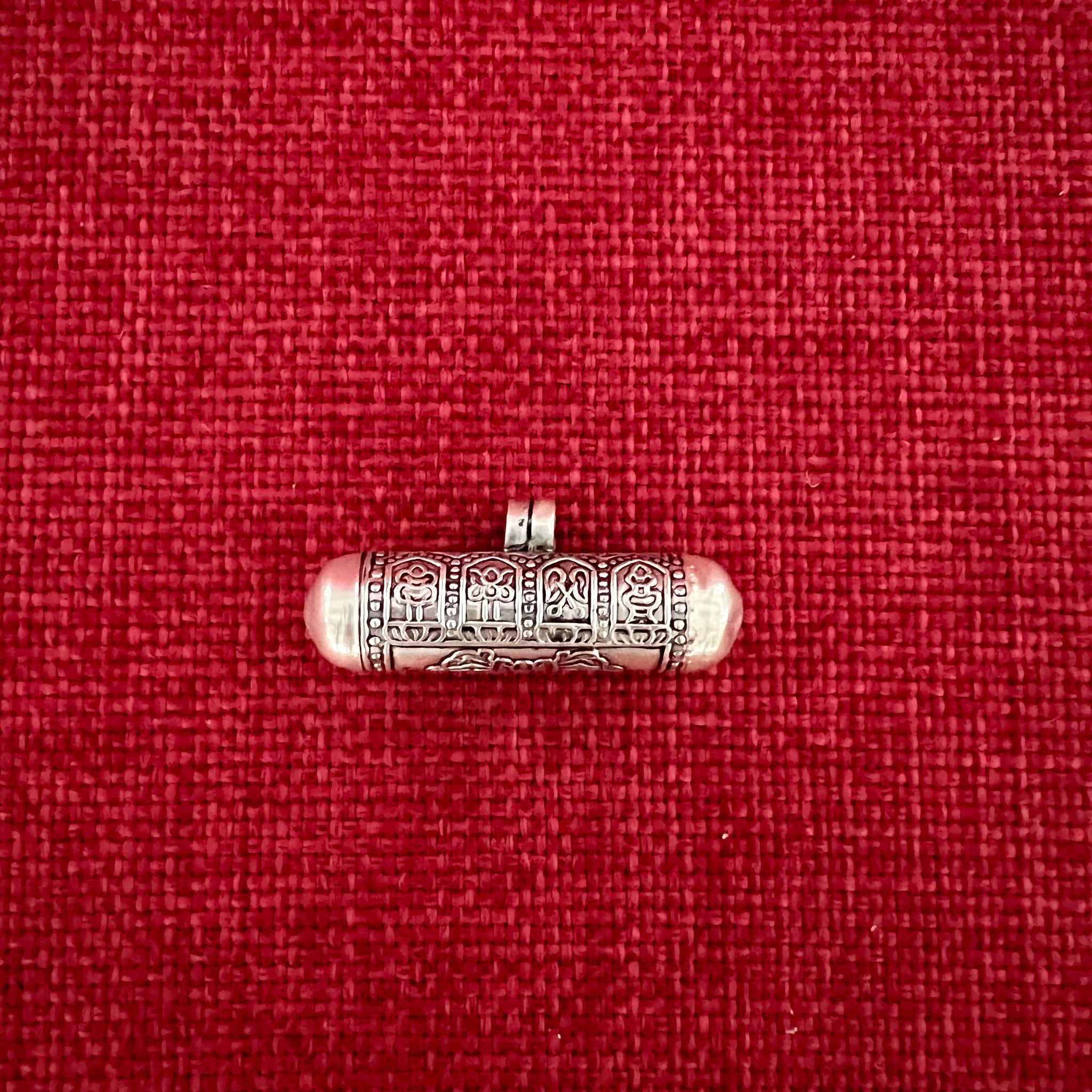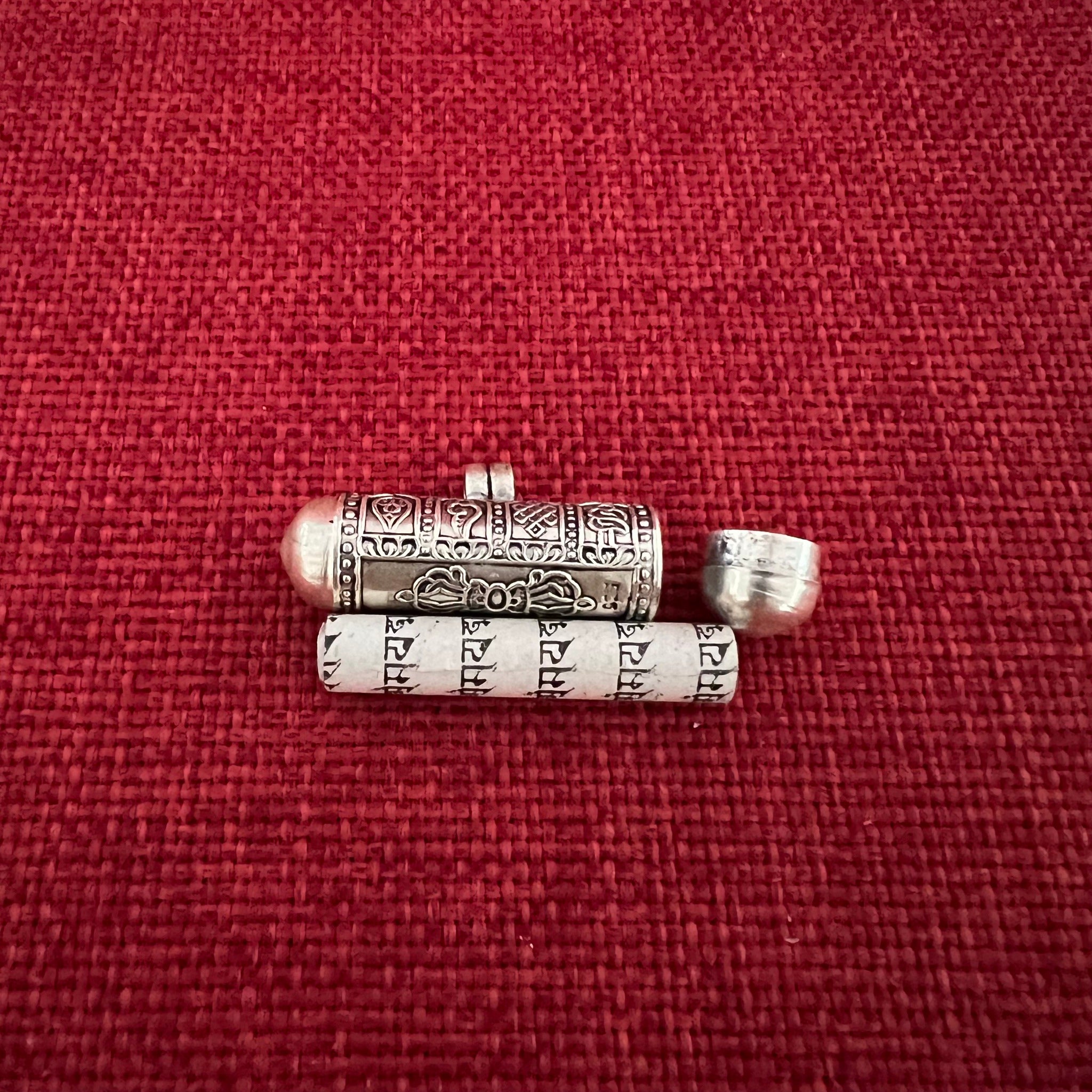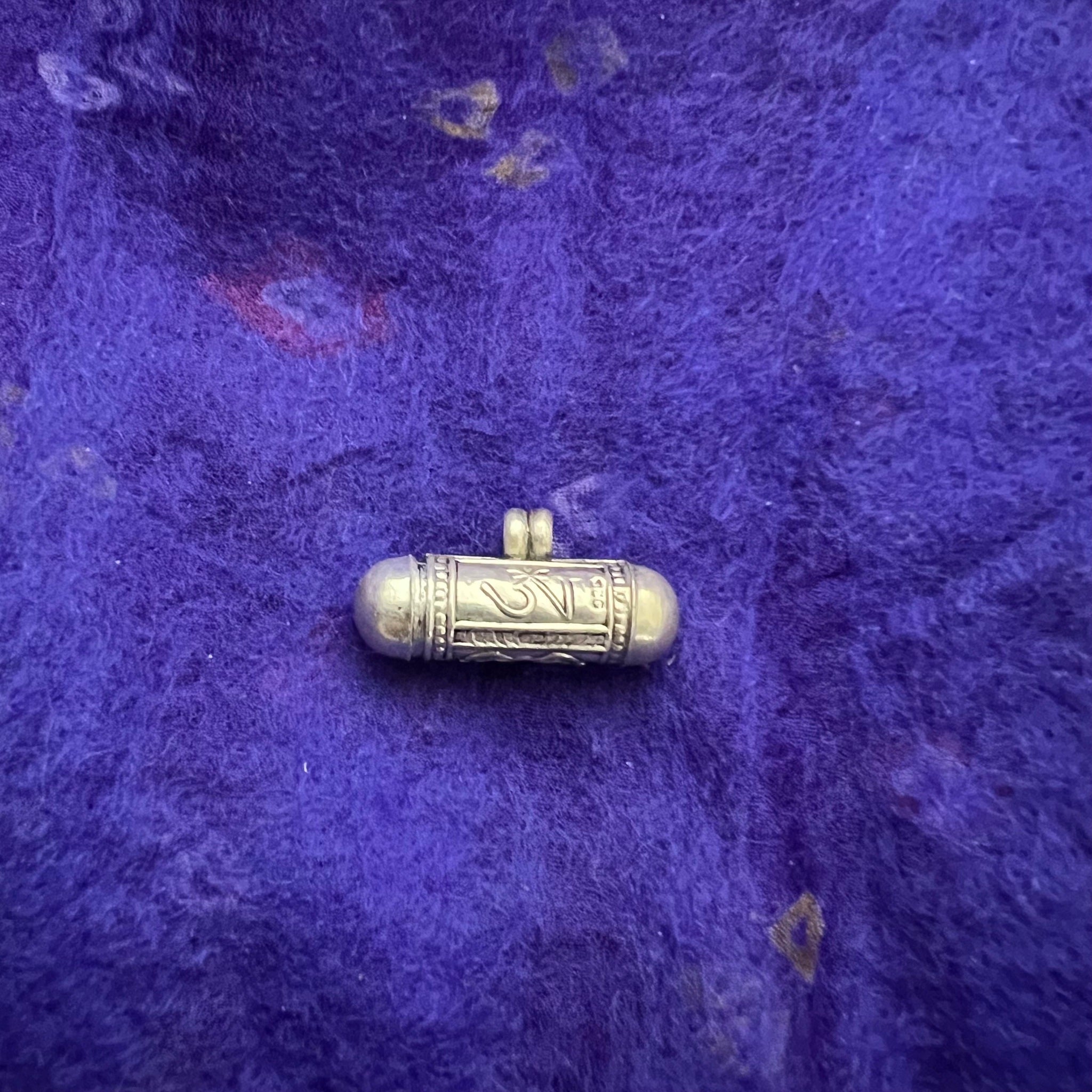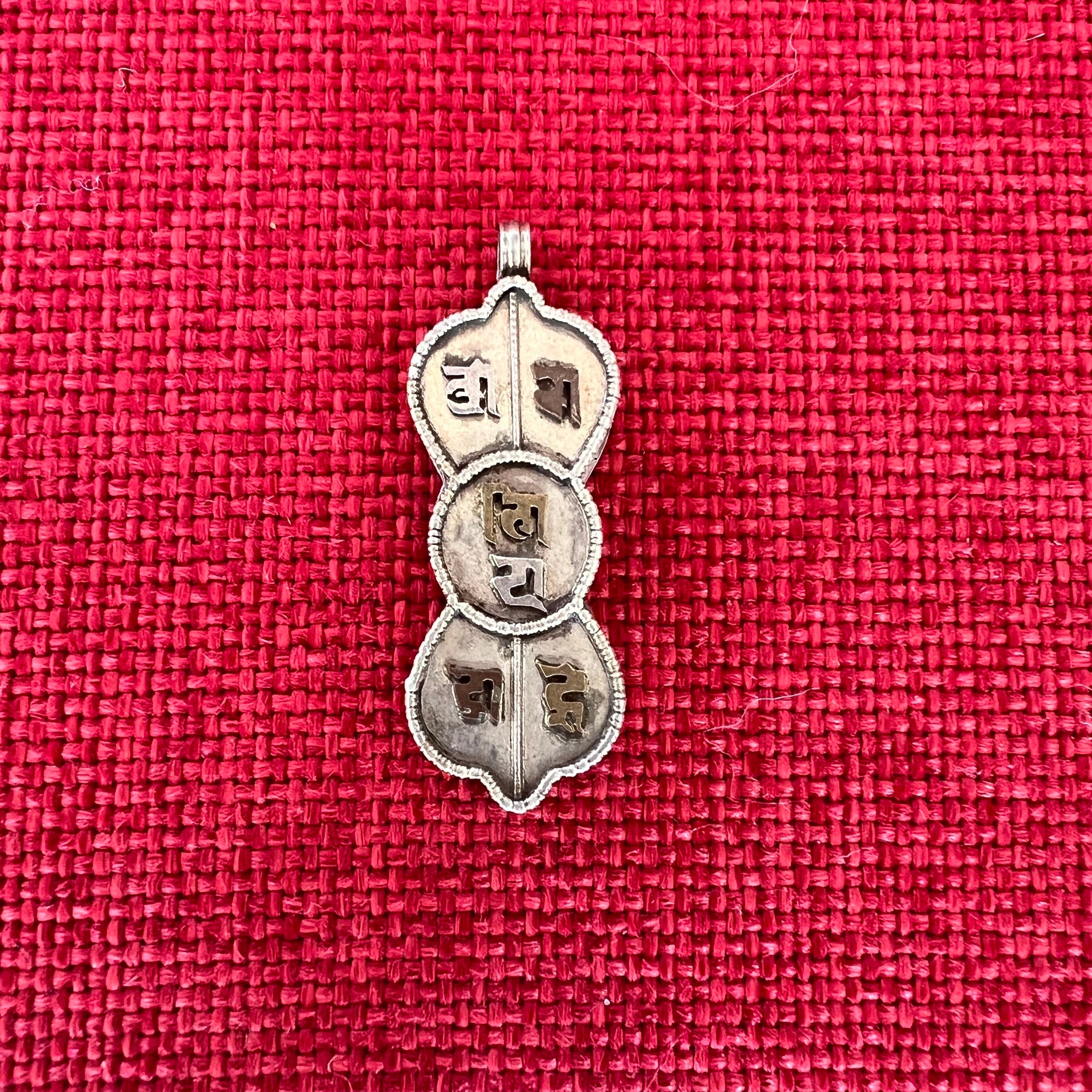 This 3.5cm Sterling Silver Cylinder Locket (or Gau in Tibetan) was handmade in Nepal and features Om Mani Padme Hung, the mantra of compassion, in Tibetan symbols on one side...
