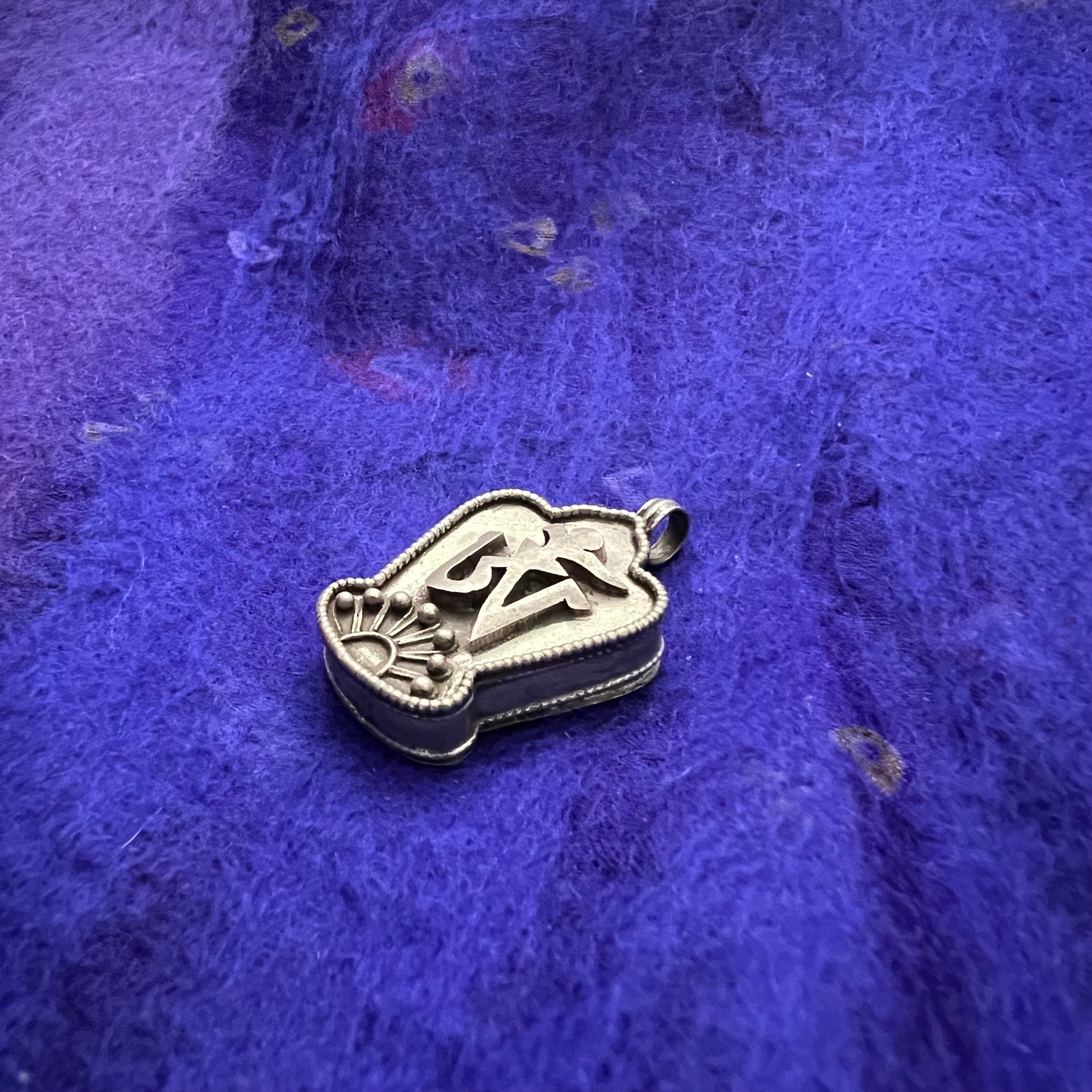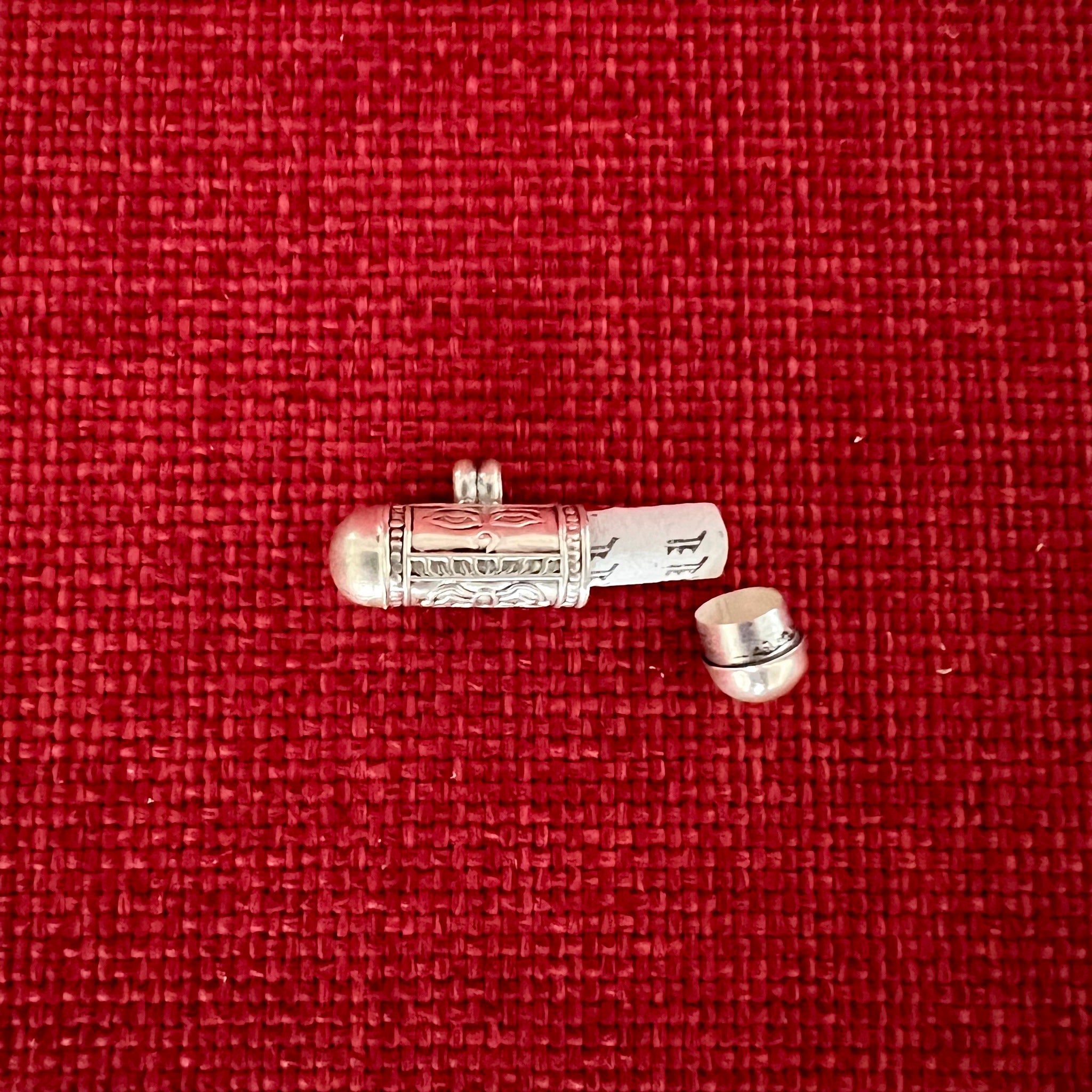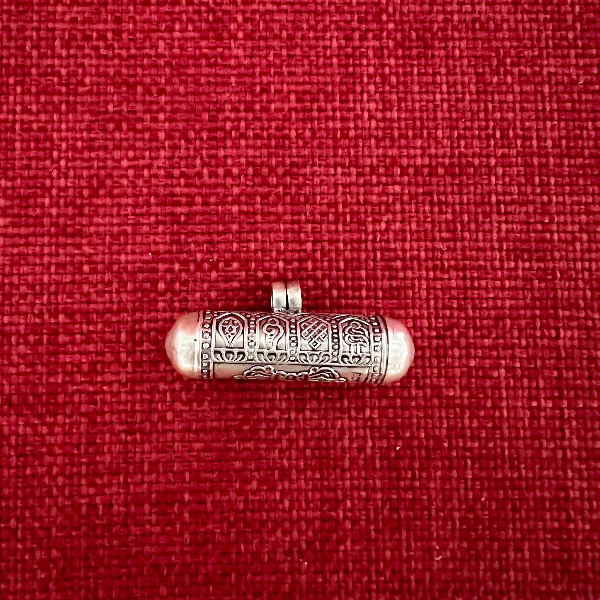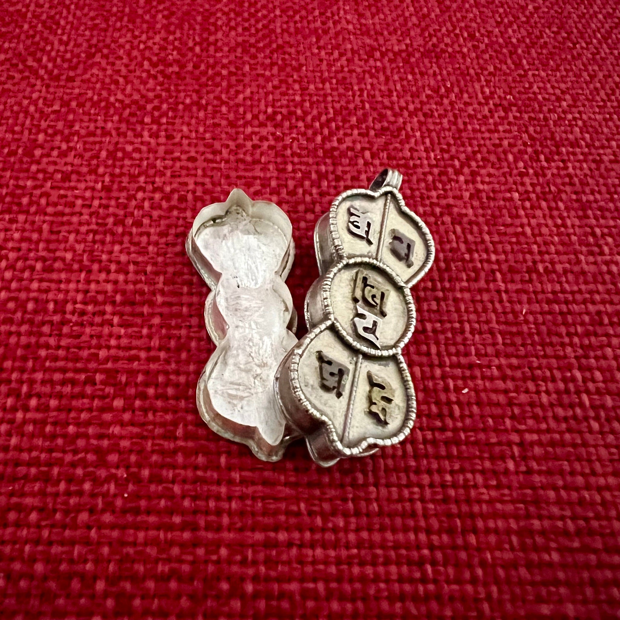 This 3.5cm Sterling Silver Cylinder Locket (or Gau in Tibetan) was handmade in Nepal and features Om Mani Padme Hung, the mantra of compassion, in Tibetan symbols on one side...