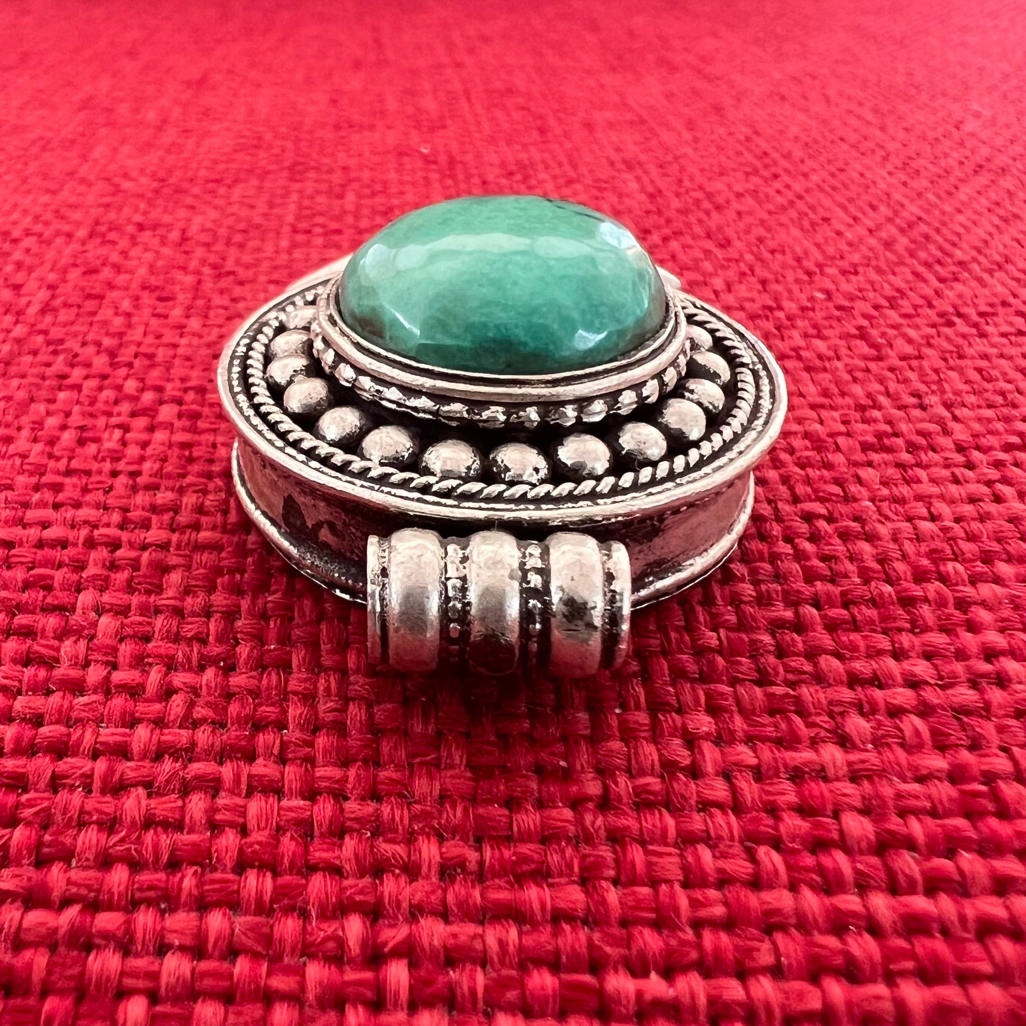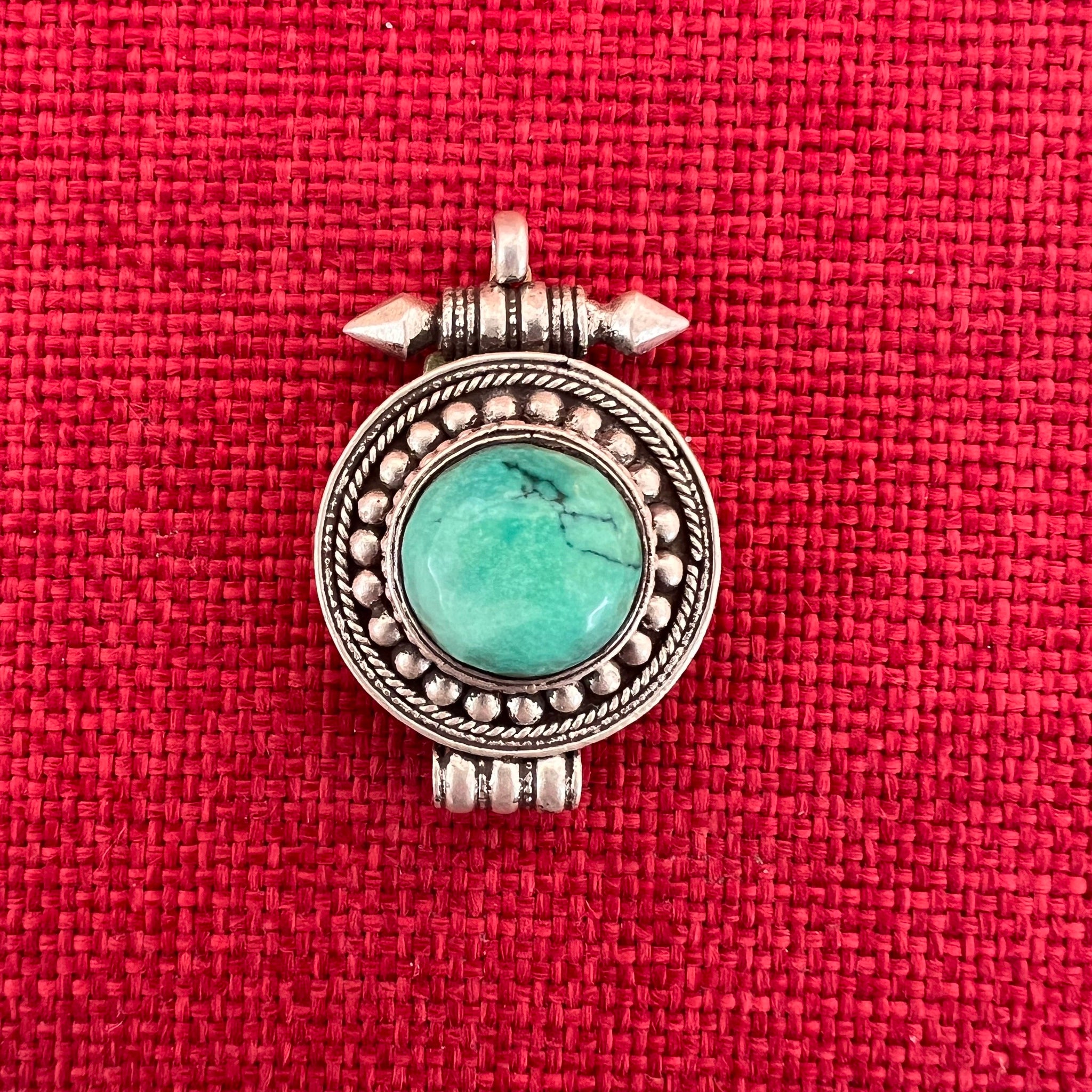 This 3cm diameter Sterling Silver Locket (or Gau in Tibetan) was handmade in Nepal and features a large green turquoise stone in the centre. The locket can be opened by...